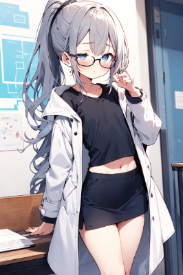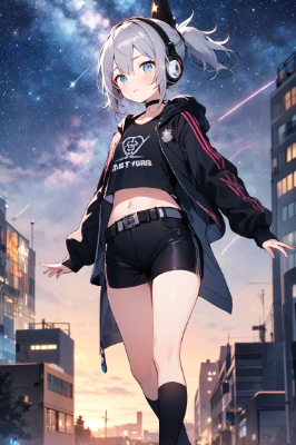 Age: 16 years old, female, dark gray hair color, ponytail, navy blue eyes, black jacket with orange line pattern, navel fully visible, black T-shirt, black shorts, black socks, black headphones, only a belt on the thighs, choker, absolute realm, big butt, flat chest, standing posture, futuristic city, starry sky.