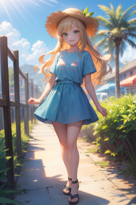 masterpiece, best quality, extremely detailed, anime, full body shot, a girl, light brown hair, braids, blue eyes, smugness, (wearing a red hood), (red colored T-shirt), (brown colored mini skirt), sandals, town by the beach, palm tree, california, cityscape, blue sky, strong sunlight, caribbean, crowd <lora:hairdetailer:1> <lora:yawanuri:1>