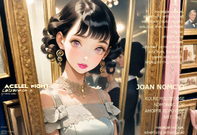 Masterpiece, top quality, highly detailed, nostalgia, vintage, advertising art, lipstick ad, watercolor, (dutch angle) woman, profile, bust shot, supermodel, long face, straight nose, downcast eyes, upturned corners of eyes, pink eyes, black hair (very very very very very short hair, naturally curly), pastel pink lipstick, large gold ring earrings, off-the-shoulder white dress, sophisticated, noble, background (night view reflected in a fixed window) <lora:eyecolle_achillea_v100:1>
