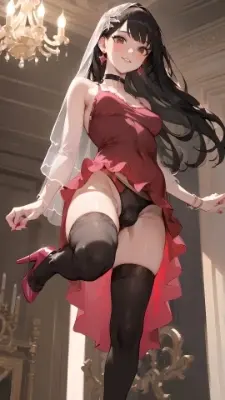 (gothic lolita, headdress, earrings, black long dress, long sleeves, see-through, white thighhighs, black high heels),