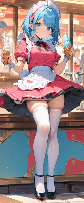 masterpiece, best quality, extremely detailed, anime, girl, skirt,bobcut,blue hair,blue eyes,maid,waitress,fluorescent color uniform,princess,white stockings,pumps,soft serve ice cream,carnival <lora:hime_style-1.0r8:0.8>