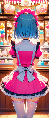 masterpiece, best quality, extremely detailed, anime, girl, skirt,bobcut,blue hair,blue eyes,maid,waitress,cherry pink color uniform,princess,white stockings,pumps,soft serve ice cream,carnival <lora:hime_style-1.0r8:0.8>