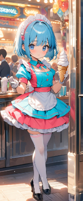 masterpiece, best quality, extremely detailed, anime, girl, skirt,bobcut,blue hair,blue eyes,maid,waitress,cherry pink color uniform,princess,white stockings,pumps,soft serve ice cream,carnival <lora:hime_style-1.0r8:0.8>