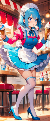 masterpiece, best quality, extremely detailed, anime, girl, skirt,bobcut,blue hair,blue eyes,maid,waitress,cherry pink color uniform,princess,white stockings,pumps,soft serve ice cream,carnival <lora:hime_style-1.0r8:0.8>