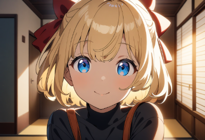 1girl,solo,blonde hair,blue eyes,short hair,hair bob,(hair bow:1.4),red bow,young girl,(anime style:1.2),kawaii,(joyful expression:1.3),(refreshed look:1.2),standing,full body,hair salon background,mirror reflection,(hair clippings on floor:1.1),summer outfit,sleeveless top,shorts,sandals,(hand touching short hair:1.2),wide smile,closed eyes,(sparkles around head:1.1),(cool breeze effect:1.1),sweat drop disappearing,(before and after comparison in thought bubble:1.2),long hair in thought bubble,chibi proportions,big head,large eyes,(cute pose:1.2),arms raised in celebration,tiptoes,hair stylist scissors in background,air conditioner,fan,summer heat waves,(cool color palette:1.1),(motion lines:1.1),floating music notes,exclamation marks,(masterpiece:1.4),(best quality:1.4),(very aesthetic:1.3),(absurdres:1.3),