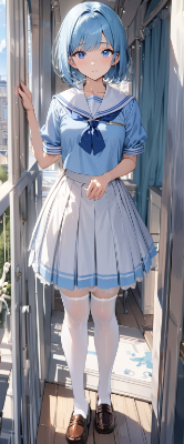 masterpiece, best quality, extremely detailed, anime, girl, skirt,bobcut,blue hair,blue eyes,maid,waitress,fluorescent pink color uniform,princess,white stockings,pumps, ,school <lora:hime_style-1.0r8:1>
