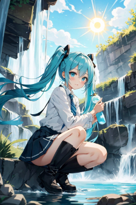 masterpiece, best quality, extremely detailed, anime, girl, skirt1girl, masterpiece, best quality, rating: general, newest,tail,blue hair,at knee high boots, tie,clear ,sun,waterfall, ,sun smile ,clear ,water,Soap bubble,blue eyes,ice crystals, hatsunemiku ,twintail,green hair , ,longhair,doodle, <lora:hairdetailer:1> <lora:hyperdetailer_v060.safetensors:1>,mini skirt,ruins,rain