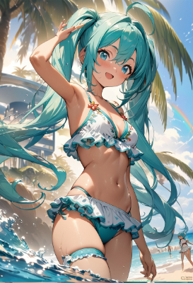 masterpiece, best quality, extremely detailed, anime, girl, ,hatsune miku,twintail,longhair,ahoge,blue hair,green hair,blue eyes,hot,summer,clear sky,sea,beach,tanned skin,bikini swimwear ,fantasymasterpiece, best quality, (high resolution:1.7), concept art, caustics, (detailed beautiful background is outdoors, hyper detailed shining illustration:1.4), extremely beautiful eyes and cute face, (hatsune miku:1.2), petite, passion, smile, open mouth, (frilled bikini with floral embroidery:1.4), polka dot print, thigh band, yellow theme, detailed water, splash water, rainbow, (dynamic composition:1.5), dynamic pose, lens flare, depth of field, foreshortening,