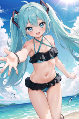 masterpiece, best quality, extremely detailed, anime, girl, ,hatsune miku,twintail,longhair,ahoge,blue hair,green hair,blue eyes,hot,summer,clear sky,sea,beach,tanned skin,bikini swimwear ,fantasymasterpiece, best quality, (high resolution:1.7), concept art, caustics, (detailed beautiful background is outdoors, hyper detailed shining illustration:1.4), extremely beautiful eyes and cute face, (hatsune miku:1.2), petite, passion, smile, open mouth, (frilled bikini with floral embroidery:1.4), polka dot print, thigh band, yellow theme, detailed water, splash water, rainbow, (dynamic composition:1.5), dynamic pose, lens flare, depth of field, foreshortening,