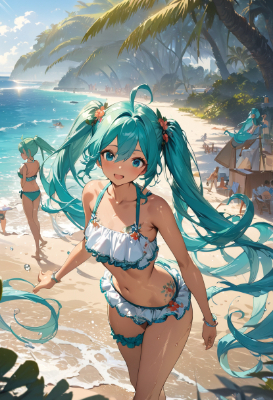 masterpiece, best quality, extremely detailed, anime, girl, ,hatsune miku,twintail,longhair,ahoge,blue hair,green hair,blue eyes,hot,summer,clear sky,sea,beach,tanned skin,bikini swimwear ,fantasymasterpiece, best quality, (high resolution:1.7), concept art, caustics, (detailed beautiful background is outdoors, hyper detailed shining illustration:1.4), extremely beautiful eyes and cute face, (hatsune miku:1.2), petite, passion, smile, open mouth, (frilled bikini with floral embroidery:1.4), polka dot print, thigh band, yellow theme, detailed water, splash water, rainbow, (dynamic composition:1.5), dynamic pose, lens flare, depth of field, foreshortening,