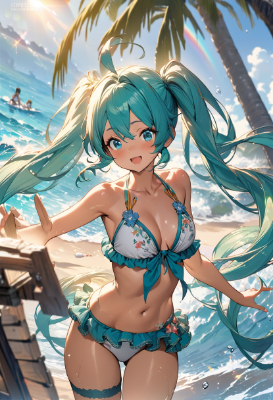 masterpiece, best quality, extremely detailed, anime, girl, ,hatsune miku,twintail,longhair,ahoge,blue hair,green hair,blue eyes,hot,summer,clear sky,sea,beach,tanned skin,bikini swimwear ,fantasymasterpiece, best quality, (high resolution:1.7), concept art, caustics, (detailed beautiful background is outdoors, hyper detailed shining illustration:1.4), extremely beautiful eyes and cute face, (hatsune miku:1.2), petite, passion, smile, open mouth, (frilled bikini with floral embroidery:1.4), polka dot print, thigh band, yellow theme, detailed water, splash water, rainbow, (dynamic composition:1.5), dynamic pose, lens flare, depth of field, foreshortening,