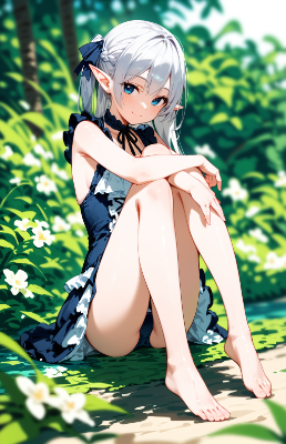 score_9,score_8_up,1girl,elf ears,solo,(silver hair),blue eyes,(Red striped bikini top and thong),blurry background,blurry,depth of field,(teasing smile),(hand on own chest),photography,Sandy beach,no trees,blue sky,waves,sea,no leaf,from below,floats,
