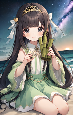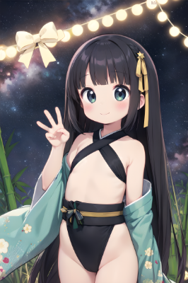 Milky way,starry sky,bamboo,1 girl,(((very longest hair))),black hair, smile,straight Hair,hair ribbon,mintgreen stripe,Black Eyes,flat chest,straight Across bangs,princess Cut, Very Long Sideburn,roundry Head,Droping eyes,cute,Meekness,Bob Cut,long back hair,12 years Old, kimono,sea