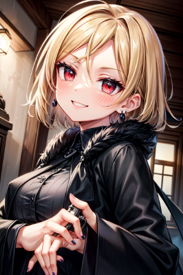 masterpiece, best quality, extremely detailed, extremely detailed face, Newest, animated painting, nice angle, Enhance colors to maximum saturation, head shot, one shot, 1girl, solo, 20yo, good-looking girl, kawaii face, bob cut, messy hair, Blonde hair, red eyes, large breasts, indoor, dark background, staring, smiling, looking at viewer, aiming at viewer, holding a gun, handgun, dynamic angle, <lora:gunAimingAtYouV1:0.5>