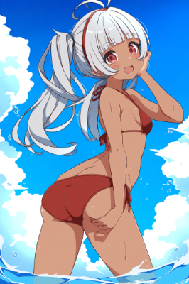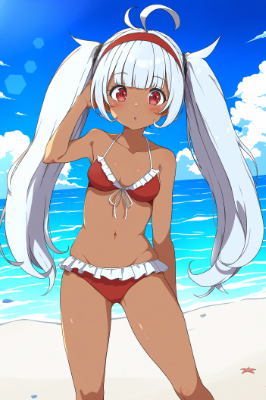 A cute girl, red eyes, gray hair, blunt bangs, double ahoges, red hairband, dark skin, small breast, very big twintails, red bikini, clear sky, beach, anime drawings, anime coloring, best quality, amazing quality, very aesthetic, absurdres
