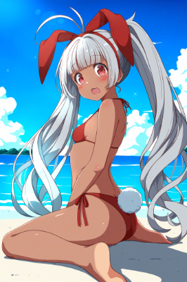 A cute girl, red eyes, gray hair, blunt bangs, double ahoges, red bunny hairband, bunny tail, dark skin, small breast, very big twintails, red bikini, clear sky, beach, anime drawings, anime coloring, best quality, amazing quality, very aesthetic, absurdres