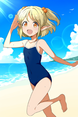 A cute girl, two side up, blonde hair, short hair, orange bobbles, elf ears, orange eyes, white headband, conpetitive school swimsuit, flat chest, white socks, white shoes, running pose, clear sky, dirt field, anime drawings, anime coloring, best quality, amazing quality, very aesthetic, absurdres