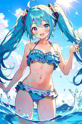 masterpiece, best quality, extremely detailed, anime, girl, masterpiece, best quality, (high resolution:1.7), concept art, caustics, (detailed beautiful background is outdoors, hyper detailed shining illustration:1.4), extremely beautiful eyes and cute face, (hatsune miku:1.2), petite, passion, smile, open mouth, (frilled bikini with floral embroidery:1.4), polka dot print, thigh band, yellow theme, detailed water, splash water, bow, (dynamic composition:1.5), dynamic pose, lens flare, depth of field, foreshortening,mini ,twintail,longhair,wet hair,ahoge,blue eyes,sea,fantasy,clear sky,butterfly,blue sky,beach,flower,green hair,blue hair