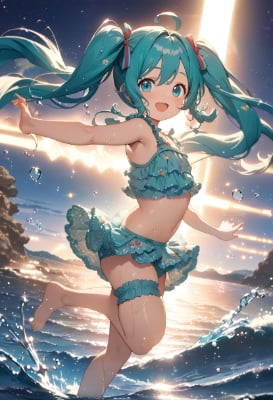 masterpiece, best quality, extremely detailed, anime, girl, masterpiece, best quality, (high resolution:1.7), concept art, caustics, (detailed beautiful background is outdoors, hyper detailed shining illustration:1.4), extremely beautiful eyes and cute face, (hatsune miku:1.2), petite, passion, smile, open mouth, (frilled bikini with floral embroidery:1.4), polka dot print, thigh band, yellow theme, detailed water, splash water, bow, (dynamic composition:1.5), dynamic pose, lens flare, depth of field, foreshortening,mini ,twintail,longhair,wet hair,ahoge,blue eyes,sea,fantasy,green hair,blue hair,ry sky,beach at ,summer,star,starry sky,full ,night,space,beach at night,1girl,deltamon_beta, solo, blue eyes, simple background, thighhighs, long sleeves, white background, dress, animal ears, bare shoulders, blue tail, earrings,pink boots, detached sleeves, green hair, sleeveless, cat ears, bag, white dress, white thighhighs, cat tail,pink backpack,yellow delta tie,pink randseru <lora:deltamon_beta:1>