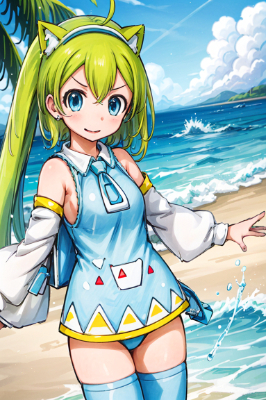 masterpiece, best quality, extremely detailed, anime, girl, masterpiece, best quality, (high resolution:1.7), concept art, caustics, (detailed beautiful background is outdoors, hyper detailed shining illustration:1.4), extremely beautiful eyes and cute face, (hatsune miku:1.2), petite, passion, smile, open mouth, (frilled bikini with floral embroidery:1.4), polka dot print, thigh band, yellow theme, detailed water, splash water, bow, (dynamic composition:1.5), dynamic pose, lens flare, depth of field, foreshortening,mini ,twintail,longhair,wet hair,ahoge,blue eyes,sea,fantasy,green hair,blue hair,ry sky,beach at ,summer,full ,beach at ,clear sky, deltamon_beta <lora:bigeye:1>,1girl,deltamon_beta, solo, blue eyes, simple background, thighhighs, long sleeves, white background, dress, animal ears, bare shoulders, blue tail, earrings,pink boots, detached sleeves, green hair, sleeveless, cat ears, bag, white dress, white thighhighs, cat tail,pink backpack,yellow delta tie,pink randseru <lora:deltamon_beta:1>
