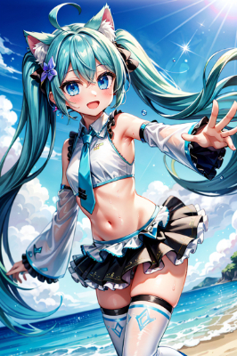 masterpiece, best quality, extremely detailed, anime, girl, masterpiece, best quality, (high resolution:1.7), concept art, caustics, (detailed beautiful background is outdoors, hyper detailed shining illustration:1.4), extremely beautiful eyes and cute face, (hatsune miku:1.2), petite, passion, smile, open mouth, (frilled bikini with floral embroidery:1.4), polka dot print, thigh band, yellow theme, detailed water, splash water, bow, (dynamic composition:1.5), dynamic pose, lens flare, depth of field, foreshortening,mini ,twintail,longhair,wet hair,ahoge,blue eyes,sea,fantasy,green hair,blue hair,ry sky,beach at ,summer,full ,beach at ,clear sky, deltamon_beta <lora:bigeye:1>,1girl,deltamon_beta, solo, blue eyes, simple background, thighhighs, long sleeves, white background, dress, animal ears, bare shoulders, blue tail, earrings,pink boots, detached sleeves, green hair, sleeveless, cat ears, bag, white dress, white thighhighs, cat tail,pink backpack,yellow delta tie,pink randseru <lora:deltamon_beta:1>