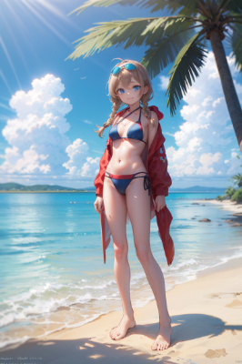 masterpiece, best quality, extremely detailed, anime, full body shot, a girl, princess, young lady, beautiful girl, beautiful, victorious, tomboy, smile, happy, be impressed, Latin, Spanish, dark eyes, dark skin, black hair, long hair, floating hair, (putting red ribbon on her hair), (yellow colored skirt-style bikini), (yellow colored off shoulder bikini), standing on the water, dip her feet in water, sea, blue sky, white thunderclouds, strong sunlight, Caribbean Sea, tropical sea, white sand beach, palm trees, midde ages, Age of Discovery <lora:yawanuri:1> <lora:hairdetailer:1>
