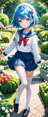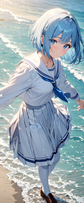 masterpiece, best quality, extremely detailed, anime, girl, skirt,bobcut,blue hair,blue eyes,sailor uniform,light blue color uniform,princess,white stockings,loafer, <lora:hime_style-1.0r8:1>,sea,beach