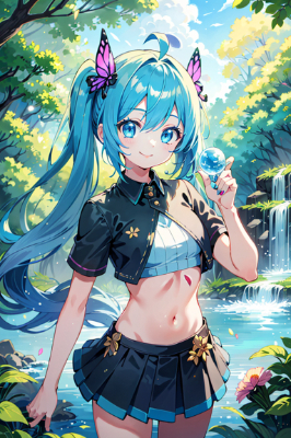 masterpiece, best quality, extremely detailed, anime, girl, skirt,mini skirt,blue hair,green hair,blue eyes,twintail,longhair,ahoge,short sleeve,butterfly,forest,flower,magic,glo mushroom,Soap bubble,hatsune miku,smile,fantasy,colorful waterfall, bikini swimwear <lora:hyperdetailer_v060.safetensors:1>