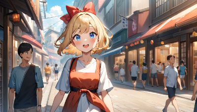 1girl,solo,loli,blonde hair,short hair,blue eyes,(hair bow:1.4),red bow,pareo swimsuit,beach sarong,floral pattern,tropical colors,questioning expression,shy pose,hand on hip,other hand adjusting sarong,standing,bare feet,sandy beach,ocean background,palm trees,sunny day,clear sky,summer atmosphere,(masterpiece:1.2),(best quality:1.3),(very aesthetic:1.1),(absurdres:1.2),