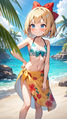 1girl,solo,young,blonde hair,short hair,blue eyes,(hair bow:1.4),red bow,reading manga,smiling,happy,kawaii,chibi style,anime style,casual clothes,t-shirt,jeans,sitting,cross-legged,indoors,bedroom,bookshelf,soft lighting,warm colors,afternoon,relaxed atmosphere,(masterpiece:1.2),(best quality:1.3),(very aesthetic:1.1),(absurdres:1.2),