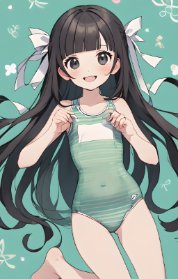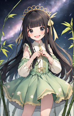Milky way,starry sky,bamboo,1 girl,(((very longest hair))),black hair, smile,straight Hair,hair ribbon,mintgreen stripe,Black Eyes,flat chest,straight Across bangs,princess Cut, Very Long Sideburn,roundry Head,Droping eyes,cute,Meekness,Bob Cut,long back hair,12 years Old, kimono,sea,swimsuit