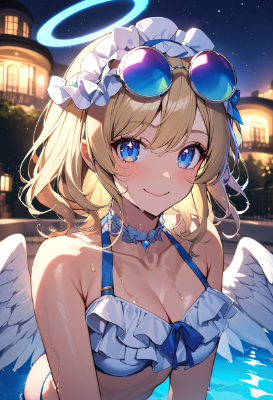 woman, plain and charming, black long hair, glasses, a little fat, angel halo, white big wings, shy, smile, pool, one piece swimwear, shiny thighs