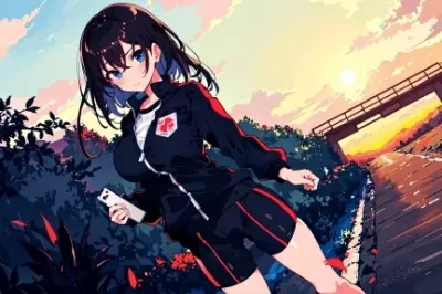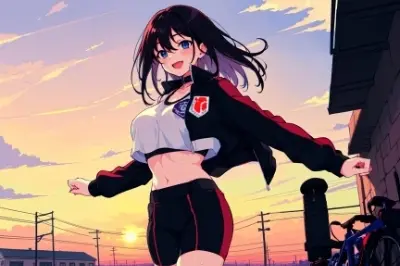 masterpiece, best_quality, high_resolution, extremely_detailed_eyes, delicate_and_intricate_hair, perfect_anatomy, dynamic_angle, depth_of_field, running, looking_at_viewer, solo, 1girl, black_hair, medium_hair, messy_hair, parted_bangs, eyebrows_visible_through_hair, blue_eyes, :d, open_mouth, large_breasts, bare_stomach, navel, thighs, smile, blush, sweat, out_of_breath, gym_uniform, open_clothes, track_jacket, long_sleeves, crop top, bike_shorts, outdoors, early_morning, gradient_sky, orange_sky, red_sky, sky, cloudy_sky, cloud, horizon, sun, sunrise, lens_flare, city, cityscape, building, skyscraper, house, tree