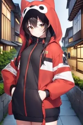cowboy_shot, looking_at_viewer, 1girl, red_hair, long_hair, blue_eyes, open_mouth, flat_chest, thighs, light_smile, blush, animal_costume, blue_hoodie, drawstring, hood_up, hooded_jacket, white_cat_hood, day, outdoors, ocean, water, beach, beachside, beach_umbrella, blue_sky, cliff, horizon, cloud, summerhouse, clothed_animal, stuffed_toy, stuffed_animal, stuffed_cat, white_cat