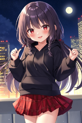 Girl in red skirt looking at the crowd, moonlight illuminates skyline, solo, skirt, night, hood, red eyes, smiling, long hair, hood down, plaid skirt, very long hair, pleated skirt, night sky, sky, red skirt, plaid, bangs, hoodie, mouth closed, moon, long sleeves , gazing, outdoors, ruffles, blush, braids, building <lora:hyperdetailer_v060.safetensors:1> <lora:Lineart-v2.0:1>