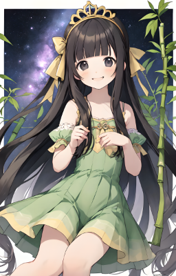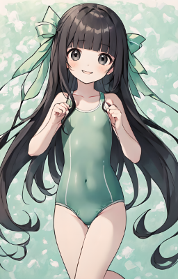 1 girl,(((very longest hair))),smile, Black hair,straight Hair,hair ribbon,mintgreen stripe,Black Eyes,flat chest,straight Across bangs,princess Cut, Very Long Sideburn,roundry Head,Droping eyes,cute,Meekness,Bob Cut,long back hair,12 years Old,Swimsuits,moon
