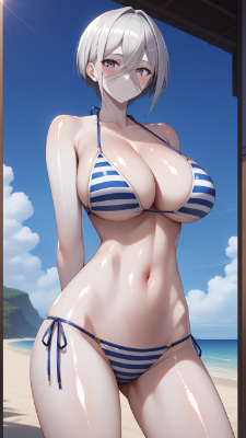 (score_9, score_8_up, score_7_up, score_6_up, score_5_up, score_4_up, source_anime), BREAK,1girl,(glowing eyes:0.5),tall,look at viewer,masterpiece,8k wallpaper,best quality,hyper resolution,Highest image quality, detailed face,shiny skin, skindentation,blue sky beach background,adult,standing,tall woman,Accurate navel,arms behind back,BREAK,silver hair,silver eyes,side ponytail,single hair bow,long hime cut hairstyle,(hair between eyes:1.3),pointy ears,very long hair,hime style,straight hair,hime cut,draped hair,cascading hair,BREAK,(slender:1.3),(pale skin,white skin:1.5),(jitome:1.5),troubled face,close mouth,blush,look at viewer,from below,(beautiful cleavage,medium breastsstring bikini,side-tie bikini,blue striped bikini),<lora:Cleavage Slider_alpha1.0_rank4_noxattn_last:4.0> <lora:Breast Slider - Pony_alpha1.0_rank4_noxattn_last:-1.0>,<lora:Age Slider V2_alpha1.0_rank4_noxattn_last:4.0>, <lora:Lip size Slider V2_alpha1.0_rank4_noxattn_last:-2.0>
