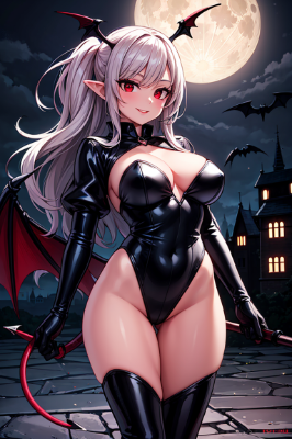 (photorealistic:1.4), (RAW photo), masterpiece, best quality, extremely detailed, vampire lady, sexual frustrated, feel horny, red eyes, pointed ears, smile, staring, black enamel leotard, super long gloves, thigh high boots, bat wings, devil