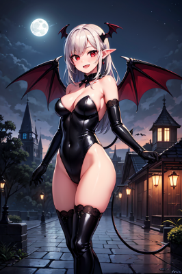 (photorealistic:1.4), (RAW photo), masterpiece, best quality, extremely detailed, lady, red eyes, pointed ears, fang, smile, staring, black enamel leotard, long gloves, thigh high boots, bat wings, devil