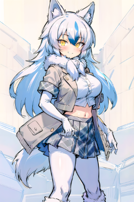 european_hare_(kemono_friends), animal ears, long hair, rabbit ears, hair over one eye,multicolored hair, brown hair, white hair,grey hair,brown eyes, extra ears, huge breasts /