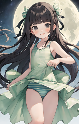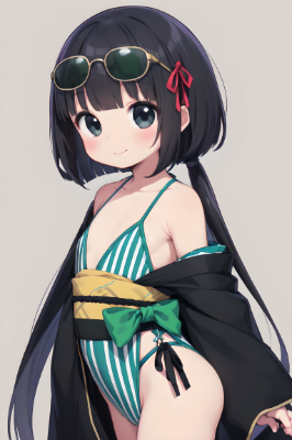 1 girl,(((very longest hair))),black hair, smile,straight Hair,hair ribbon,mintgreen stripe,Black Eyes,flat chest,straight Across bangs,princess Cut, Very Long Sideburn,roundry Head,Droping eyes,cute,Meekness,Bob Cut,long back hair,12 years Old, kimono,swimsuit,god