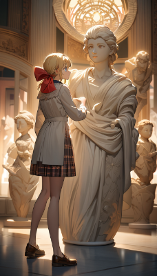 1girl,solo,blonde hair,short hair,red ribbon,(hair bow:1.4),red bow,blue eyes,looking at sculpture,museum,indoors,awestruck expression,delicate,detailed background,anime style,headband,ribbon in hair,intricate sculpture,beautiful detailed eyes,beautiful detailed lighting,standing,full body,side view,small breasts,school uniform,white shirt,plaid skirt,brown shoes,natural pose,focused look,soft lighting,gentle smile,medium hair length,hair ornament,expressive eyes,smooth skin,soft shading,dynamic angle,elegant setting,finely detailed artwork,awe-inspiring,classical art,marble statue,light streaming in,serene atmosphere,cultural appreciation,detailed architecture,vibrant colors,well-defined features,subtle highlights,anime-style rendering,enchanting setting,intricate details,gallery environment,classic beauty,cultural heritage,sense of wonder,absorbing the scene,captivated,soft shadows,sophisticated setting,refined details,art appreciation,expressive gaze,observing closely,serene expression,art lover,cultural scene,refined taste,focused expression,delicate features,vibrant lighting,classical sculpture,anime girl,delicate pose,intricate background,art gallery,soft expression,youthful beauty,admiring art,soft colors,gentle shading,intricate textures,elegant sculpture,light reflections,delicate shading,finely crafted details,refined art,cultured atmosphere,art connoisseur,artistic surroundings,thoughtful expression,peaceful setting,intricate architecture,art enthusiast,harmonious scene,soft gaze,art admiration,contemplative look,soft lighting,refined background,anime-inspired,delicate rendering,art museum,elegant details,serene gaze,subtle expression,gentle lighting,short blonde hair,light red ribbon,blue detailed eyes,marveling at sculpture,rich colors,detailed shadows,calm expression,anime character,delicate shading,intricate sculpture details,refined pose,art-inspired,sophisticated expression,elegant environment,cultural admiration,delicate colors,gentle highlights,rich textures,short hair,anime-style face,intricate background elements,serene look,gentle gaze,refined textures,smooth lighting,admiring sculpture,