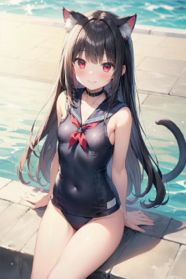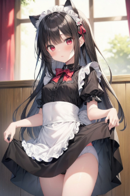1girl, ((masterpiece)), ((best quality)), (ultra-detailed), ((kawaii)), (lovely),game cg,14years old,(cat ear:1.3),((small breasts:1.3)),red eyes,black hair,long hair,hair intakes