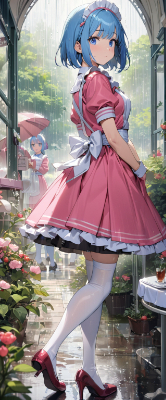 masterpiece, best quality, extremely detailed, anime, girl, skirt,bobcut,blue hair,blue eyes,maid,waitress,cherry pink color uniform,princess,white stockings,pumps, <lora:hime_style-1.0r8:0.8> <lora:noline:1> <lora:hairdetailer:1> <lora:sanDka1:1>,rain,garden