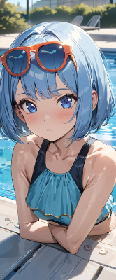 masterpiece, best quality, extremely detailed, anime, girl, ,bobcut,princess,two piece swimwear,blue hair,blue eyes,pool <lora:hime_style-1.0r8:1> <lora:noline:1> <lora:hairdetailer:1> <lora:sanDka1:1>,sunglasses