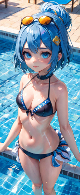 masterpiece, best quality, extremely detailed, anime, girl, ,bobcut,princess,two piece swimwear,blue hair,blue eyes, <lora:hime_style-1.0r8:1> <lora:noline:1> <lora:hairdetailer:1> <lora:sanDka1:1>,sunglasses,beach