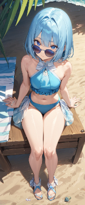 masterpiece, best quality, extremely detailed, anime, girl, ,bobcut,princess,two piece swimwear,blue hair,blue eyes, <lora:hime_style-1.0r8:1> <lora:noline:1> <lora:hairdetailer:1> <lora:sanDka1:1>,sunglasses,beach