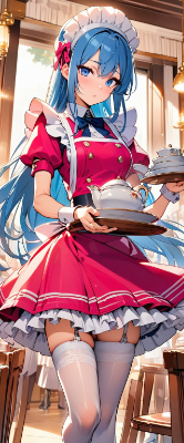 masterpiece, best quality, extremely detailed, anime, girl, skirt,blue hair,blue eyes,maid,waitress,cherry pink color uniform,princess,white stockings,pumps,longhair <lora:hime_style-1.0r8:1> <lora:noline:1> <lora:hairdetailer:1> <lora:sanDka1:1> <lora:hime_style-1.0r8:1>