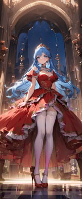 masterpiece, best quality, extremely detailed, anime, girl, skirt,blue hair,blue eyes,dress,red color dress,princess,longhair,white stockings,pumps,fantasy,night <lora:hime_style-1.0r8:1> <lora:noline:1> <lora:hairdetailer:1> <lora:sanDka1:1>
