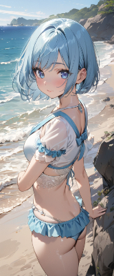 masterpiece, best quality, extremely detailed, anime, girl, skirt,bobcut,blue hair,blue eyes,sailor uniform,light blue color uniform,princess,white stockings,loafer, <lora:hime_style-1.0r8:1>,beach